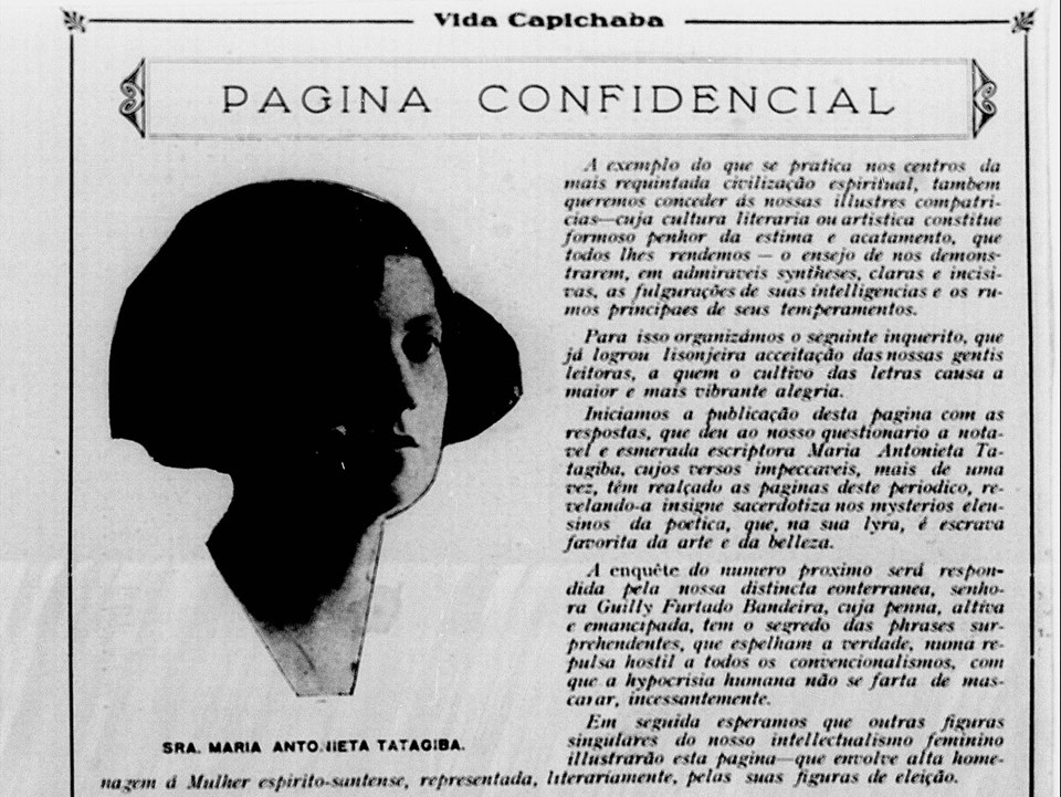 SCOLFORO, Jória. Maria Antonieta Tatagiba e a literatura feita por mulheres. Governo do ES, 2017. Disponível em: <https://www.es.gov.br/Noticia/maria-antonieta-tatagiba-e-a-literatura-feita-por-mulheres>. Acesso em: 24 out 2022.